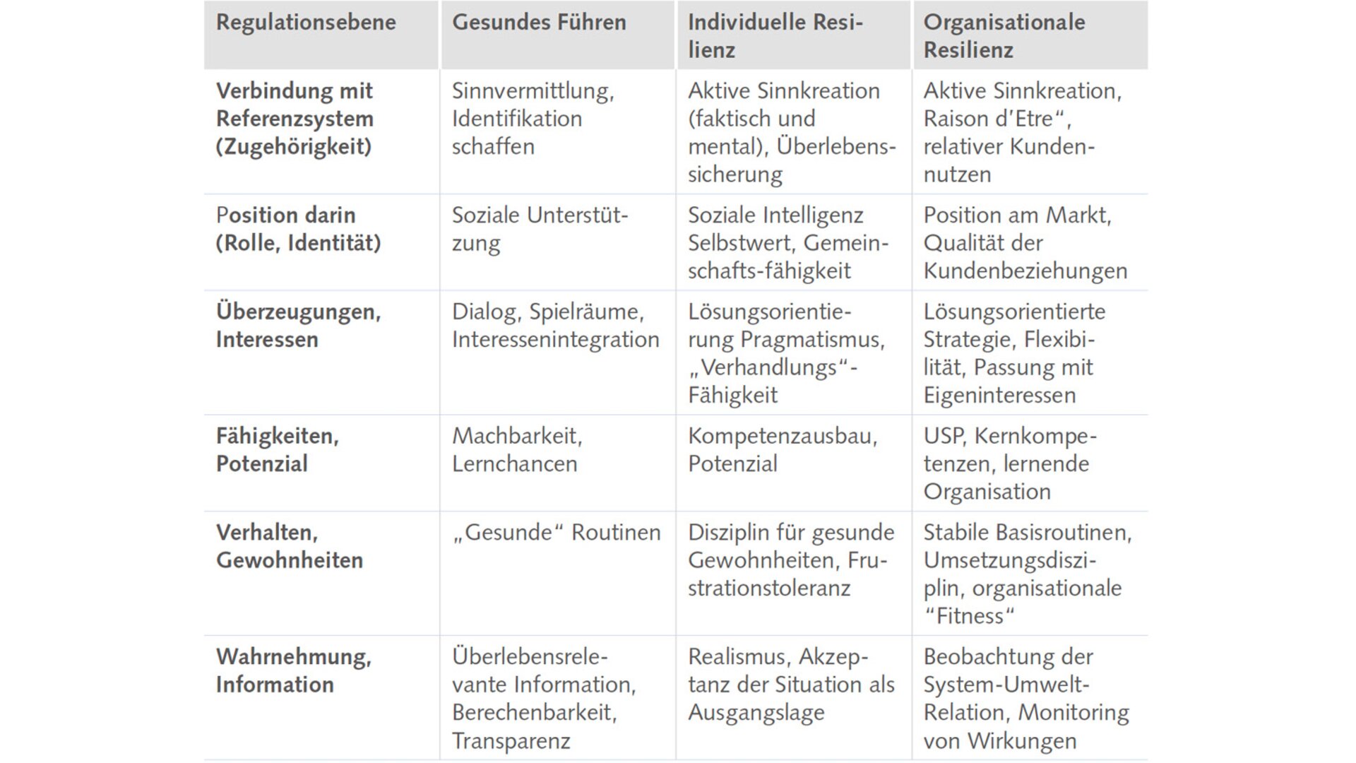 Die Schlüsselkriterien für «gesundes Führen», aber auch für individuelle und organisationale Resilienz lassen sich auf verschiedenen Handlungsebenen identifizieren. Die Kategorie «Sinn» umschreibt dabei stets die überlebensrelevante erfolgreiche Anpassung an die Systemumgebung. Organisationen, deren Existenzgrund Sinn ergibt, die sich rasch an die Systemumgebung anpassen können, die eine gute und enge Kundenbindung aufweisen, deren Strategien radikal lösungsorientiert und zukunftsgewandt sind, dürften bessere Überlebenschancen haben. Es erfordert ein Umdenken und ein Umorganisieren der Führung, wenn tief verstanden wird, dass dabei mehr «von außen nach innen» als «von oben nach unten» gedacht werden muss. Kompetenz im Sinne von Lernfähigkeit nicht nur auf individueller, sondern auf organisationaler Ebene in diesem Sinn zeichnet die «lernenden Organisationen» aus. Die Sicherung (überlebens-)relevanter Basisprozesse und eine stabile Arbeitsdisziplin sowie Zugang zu relevanter Information sind entscheidend für das Durchhaltevermögen in kritischen Situationen.